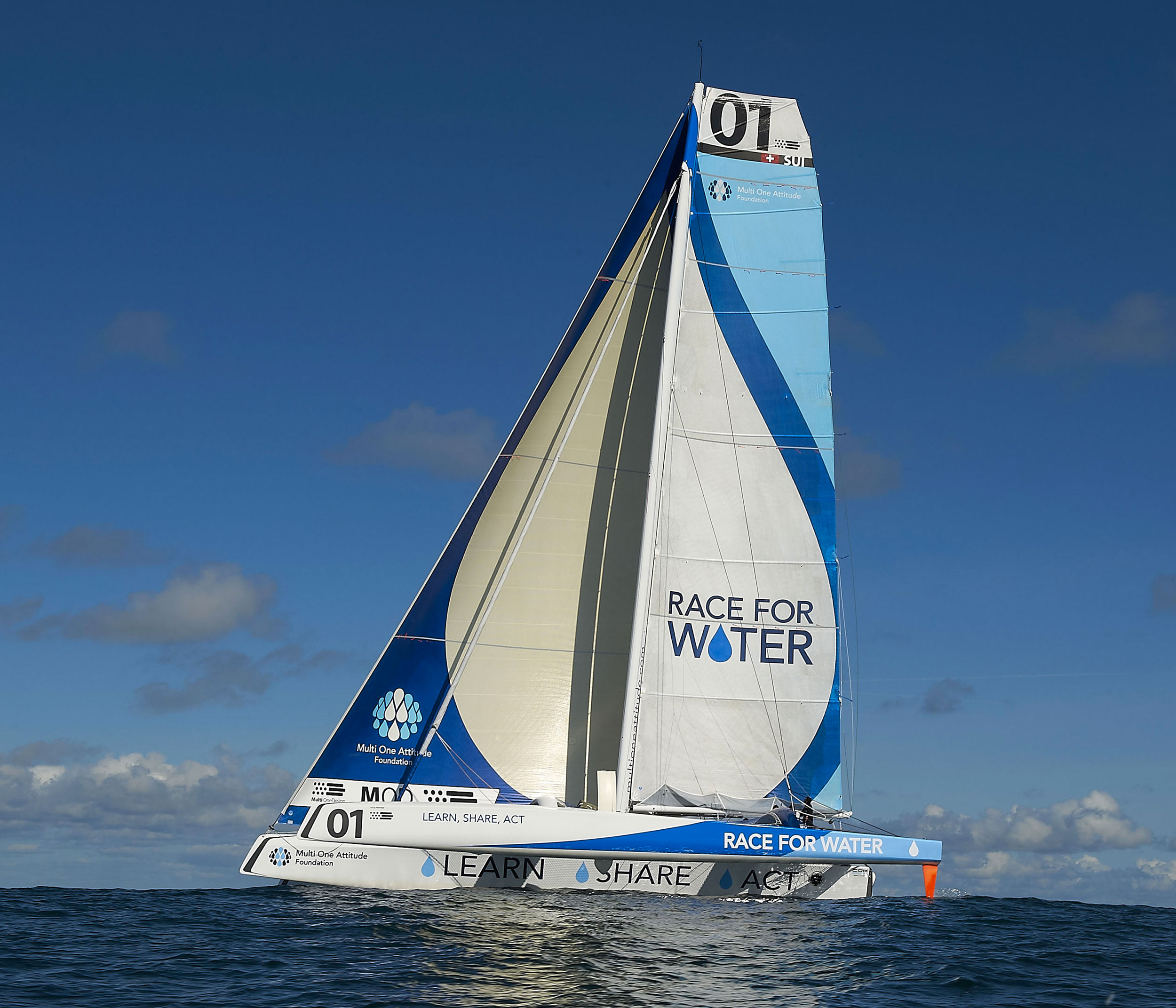 The concept was to combine a drop of water – the icon of the foundation – with the shape of the boat. This symbol is visible both from the sides and from the top. The team wanted to distinguish themselves from other trimarans, in which commercials detract from the purity of the boat. The slogan “Learn, Share, Act” is found on the central floater and reveals its impact as soon as “Race for Water” gets underway.